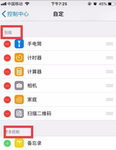 2、点击【自定控制】,进入控制中心设置界面,如下图所示,目前我们在控制中心可以用到的功能就是【包括】栏目下的六个,而下方【更多控制】中的功能都是大家可以添加到控制中心当中的。