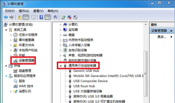 2、进入到计算机管理界面后在左侧点击【设备管理器】,接着在右边点击【通用串行总线控制器】,看是否有黄色感叹号的驱动,有的话就表示驱动未安装成功。
