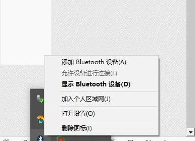 2、鼠标移到上方,右击鼠标,出现菜单,添加设备就是我们要添加一个或几个蓝牙设备,比如蓝牙鼠标就是一个设备,显示蓝牙设备,就是显示当前和电脑配对的蓝牙设备,加入个人局域网,这个是通过蓝牙连接手机上网的,一般用不到,设置是对电脑蓝牙进行设置。