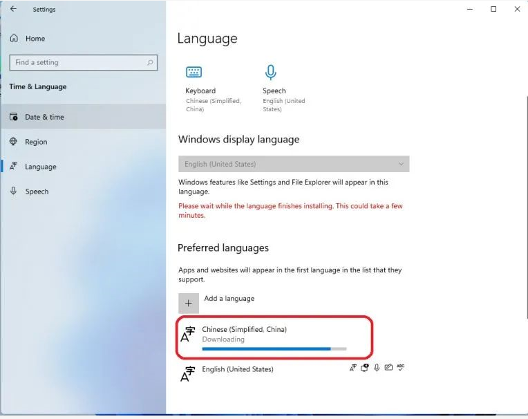 设置系统语言为简体中文方法:开始→settings→Time & Language→Language然后点击下方的Add a