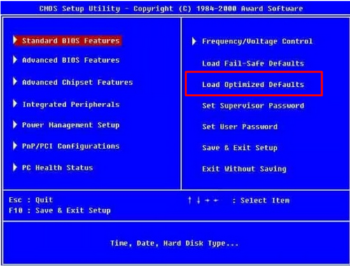 在bios设置界面中,将光标移动到“Load Optimized Default”项,并按回车键。