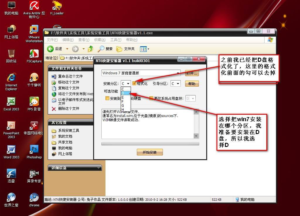 之前我们教程中使用的是D盘作为win7的系统盘符,所以我们在HT6快捷安装器中的“安装分区“选择D盘。