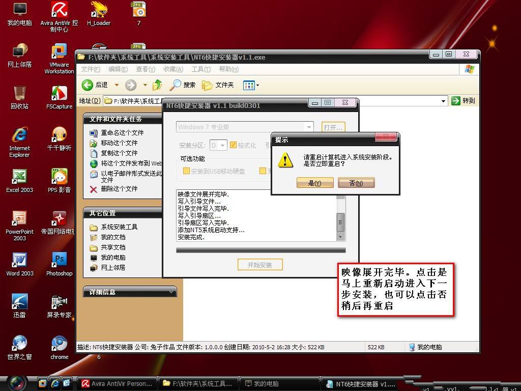 完毕之后,会继续弹出一个询问你是否立即重启的对话框,没有其他问题的话就可以点击”是“,之后会重新启动自动安装win7系统了。