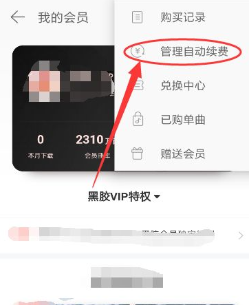 4、点击下拉菜单里的“管理自动续费”一栏。