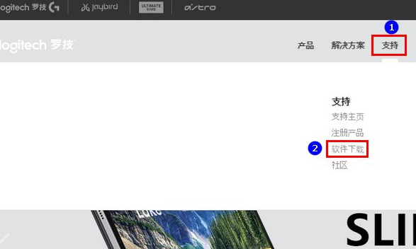 2、打开罗技官网之后,鼠标移到“支持”一项上,然后等到下方出现菜单后点击“软件下载”。