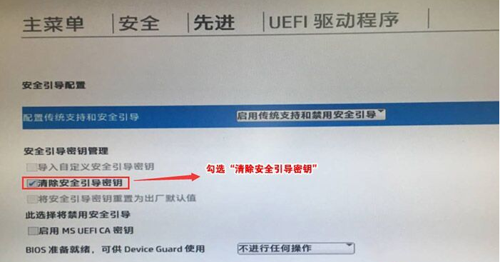 4、保存重启后,按照上面的操作进入bios设置界面,勾选“清除安全引导密钥”项,然后再次按F10进行保存设置,如图所示;