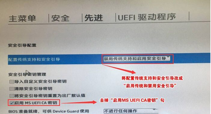 3、进入页面后,找到“配置传统支持和安全引导”,设置为“禁用传统支持和启用安全引导”,并取消下面的“启用MS UEFI CA密钥”的选择,然后按下F10键进行保存设置;