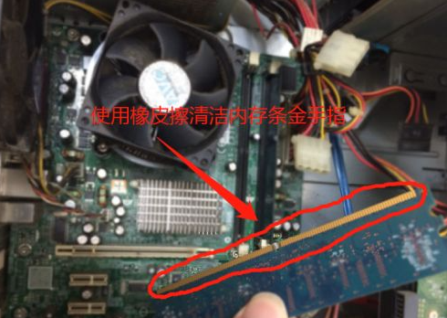 4、我们用手拨开内存条卡槽两端卡扣,然后将内存条拿出来,再用橡皮擦清洁一下内存条表面金手指,清洁干净后重新安装进去或者更换一个内存条卡槽进行安装。