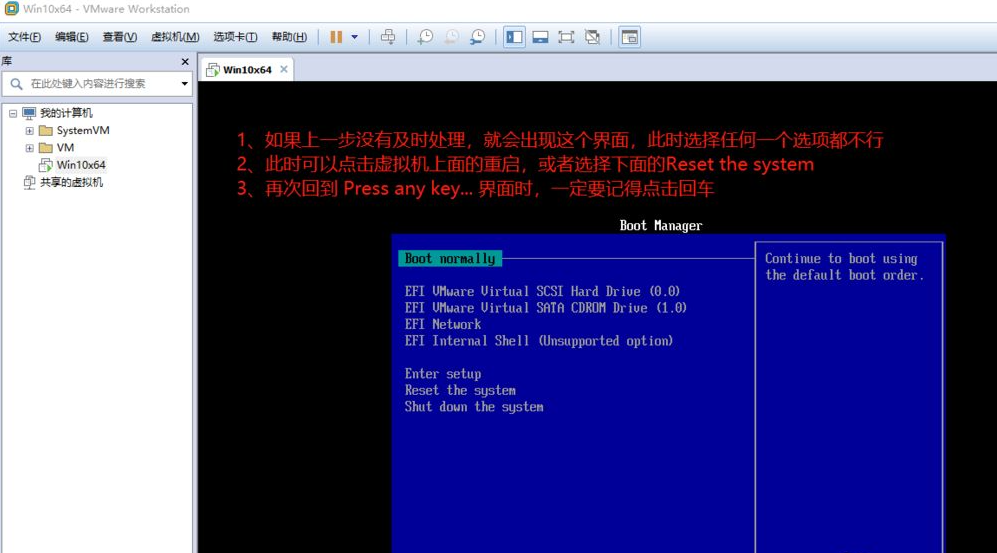 10、虚拟机中开始安装win10的时候,出现界面【Press any key to boot from CD or DVD ...】,此时一定要将光标至于虚拟机中,然后按任何一个按键,通常按回车即可。如果这一步没有及时按的话,就会出现第二个图一样的界面,此时只能重启安装,重新选择了。