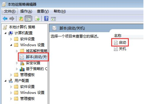 2、在打开的窗口左侧菜单中依次点击展开计算机配置—windows设置—脚本(启动/关闭),然后在右侧双击启动。