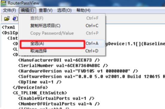 4.我们点击窗口中的“编辑”选项,在选项下选择“全选”把所有的文字复制下来,粘贴到记事本里。
