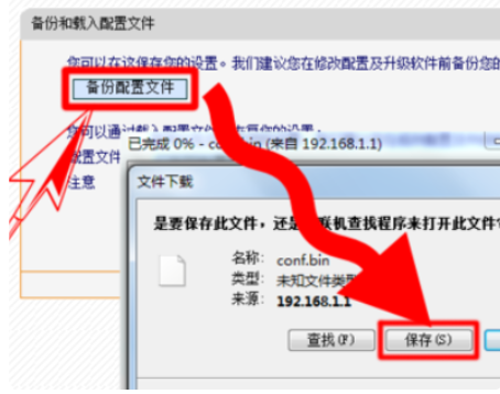 1.首先我们登陆路由器,用路由器的“备份配置文件”功能把路由器的配置导出到电脑上,然后在页面中我们点击备份配置文件,接着点击“保存”按钮。