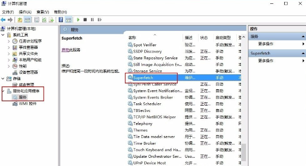 3、在计算机“服务”界面列表中找到Superfetch服务;