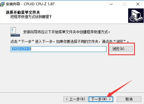 4、点击“浏览”选择Cpu-Z的开始菜单文件夹,我们只需保持默认选择即可,然后点击“下一步”。