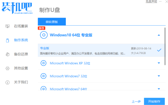 1.先在一台可用的电脑下载安装好装机吧一键重装系统软件并打开,插入一个 8GB 以上 U 盘,在制作系统中点击开始制作。