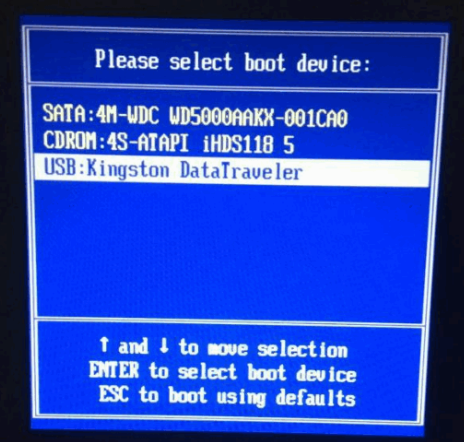 4.把u盘启动盘插入要重装的电脑中,开机不断按启动热键进快速启动项,选择u盘启动项回车。