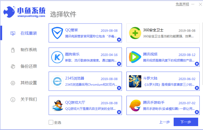 1.先下载并安装小鱼一键重装系统工具,在台式电脑上打开,关闭电脑杀毒软件,备份C盘重要信息。然后选择需要安装的系统,点击安装系统。