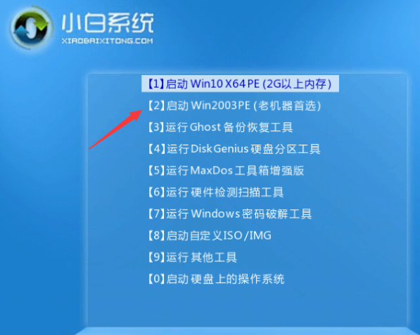 6.在一个小白板系统界面上,选择老型号02启动win2003PE。