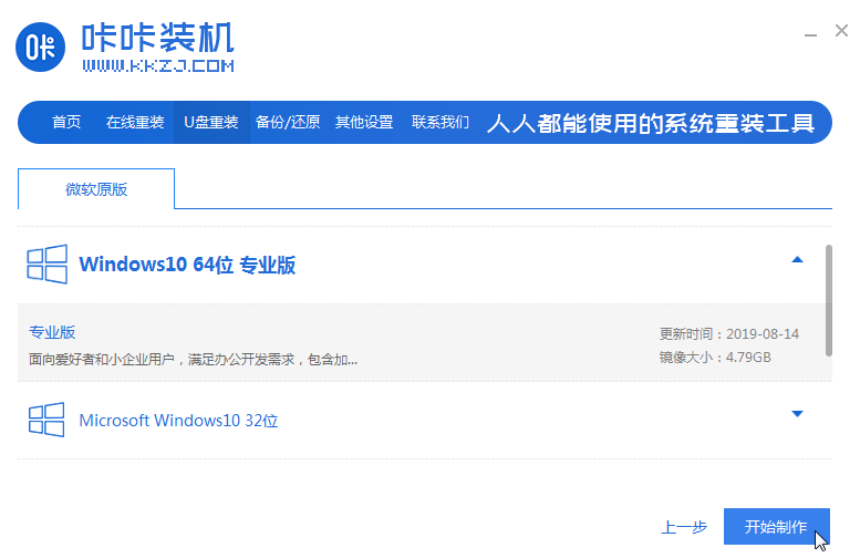1.首先在一台可用的电脑上下载安装咔咔装机一键重装系统工具并打开,插入8g以上的空白u盘,选择u盘重装系统模式点击开始制作。