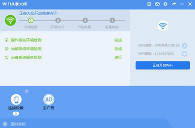 3.那么此时软件就会自动创建一个Wifi热点,创建完成后,在该页面可以看到Wifi名称和密码。