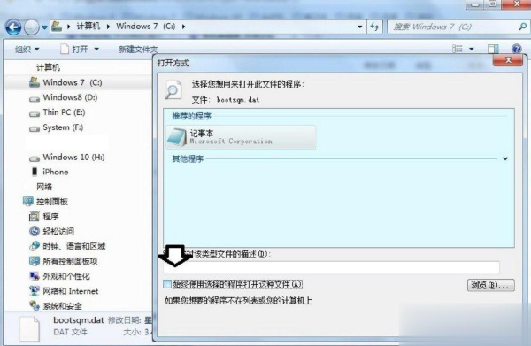 6.进入到选择打开方式的页面,选择【记事本】并将下方的【始终打开】勾选去掉。