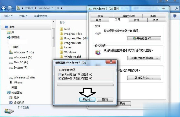 1.首先进入到系统属性页面-工具-查错-点击【开始检查】,在弹出的窗口中将两个选项都勾选上,选择【开始】。