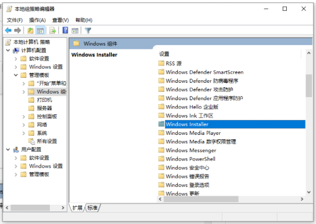 2、接着在界面中依次选择“计算机配置”——“管理模块”——“windows组件”——“windows installer”展开。