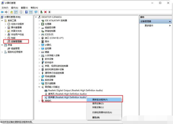 2、点击设备管理器进入后,展开音频输入和输出选项,鼠标右键对应的声卡硬件设备并选择更新驱动程序。