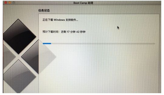 6.点击安装后BootCamp助理会下载windows支持软件,执行磁盘分区操作,预计时间可能15-20分钟,耐心等待下载完成。