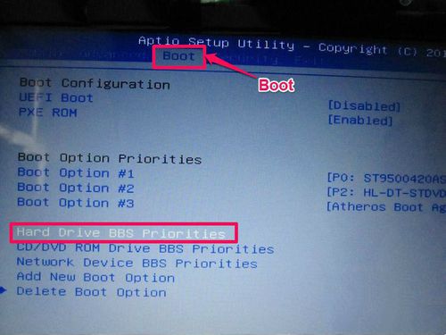 如果要设置启动,选择Hard Drive BBS Priorities这一项,这是硬盘选择项,有的电脑上有几块硬盘,需要选择其中一块,U盘也被认为是硬盘的一种,如果用U盘启动,也先要进入此项选择。