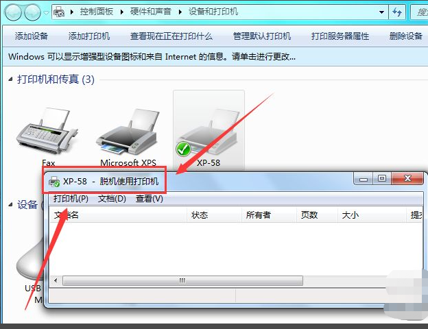 5.可以看到打印机图标(xp-58)显示为亮色就可以了,这样咱们就解决这个打印机的脱机问题了。现在就可以去试试打印机是否可以打印出纸!