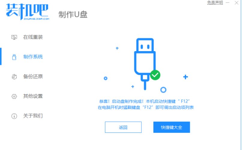 1、在一台可用的电脑上安装装机吧一键重装系统软件并打开,准备一个 8GB 以上 U 盘,在制作系统中点击开始制作。