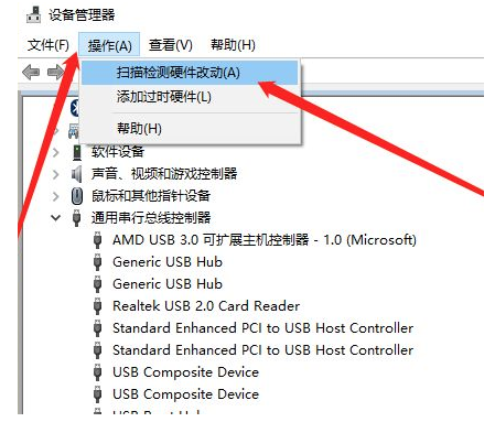 6、USB大容量存储设备消失之后,点击上面“操作”,弹出选择“扫描检测硬件改动”。
