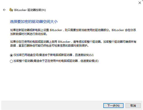 5、选择要加密的驱动器空间大小,根据提示按自己的需求选择即可。