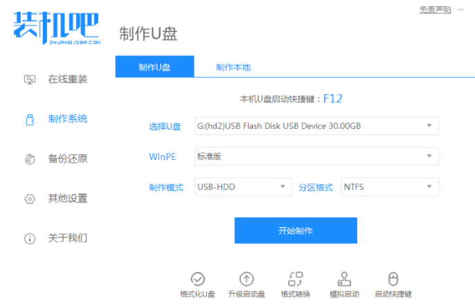 1、准备一个8g以上的u盘。下载并打开装机吧软件,点击制作系统,选择我们想要的win7系统开始制作。