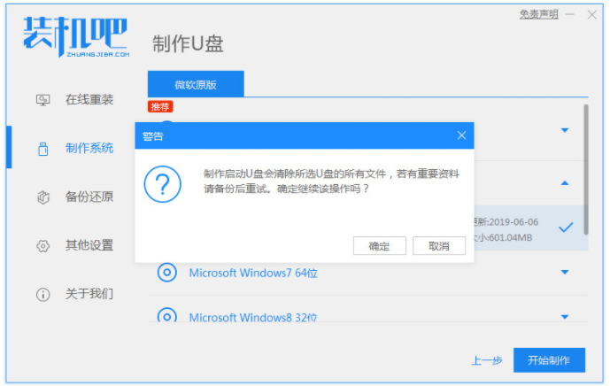 1、下载一个装机吧一键重装系统软件并打开。准备一个8GB以上的U盘。选择制作系统,在制作U盘中选择您的U盘,其它参数默认直接开始制作即可。