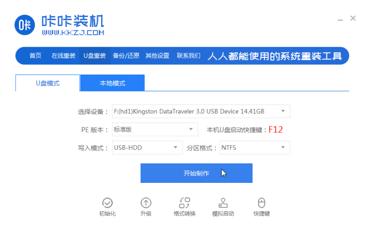 1、u盘怎么安装win10?先在一台可用的电脑上下载安装咔咔装机一键重装系统工具并打开,插入一个8g以上的空白u盘,选择u盘重装系统模式,点击开始制作。
