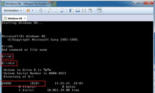 8.自动重启后,输入: ;D:; --> 按键 ;回车; 切换分区。在输入: ;dir; --> 按键 ;回车; 查看 当前目录 有什么文件:看到 d盘分区。下面有个 win98 目录如果Diskgenius下面复制进去的是win98 SE就会看到SE的。