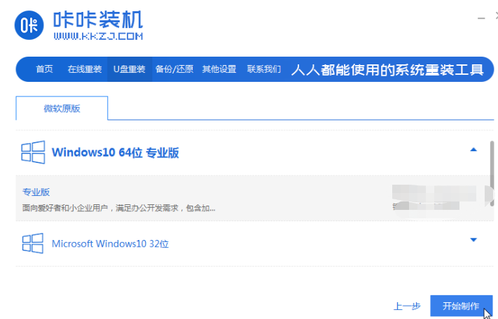 1、下载安装咔咔装机一键重装系统工具并打开,插入一个8g以上的空白u盘,选择u盘重装系统模式点击开始制作。
