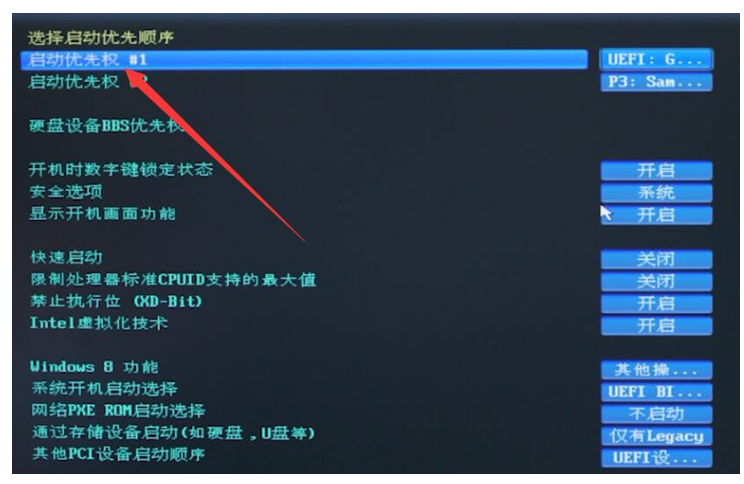 2、按下bios启动快捷键,进入bios界面,选择启动优先权 #1选项,回车选择带USB字样的选项,按F10保存重启电脑