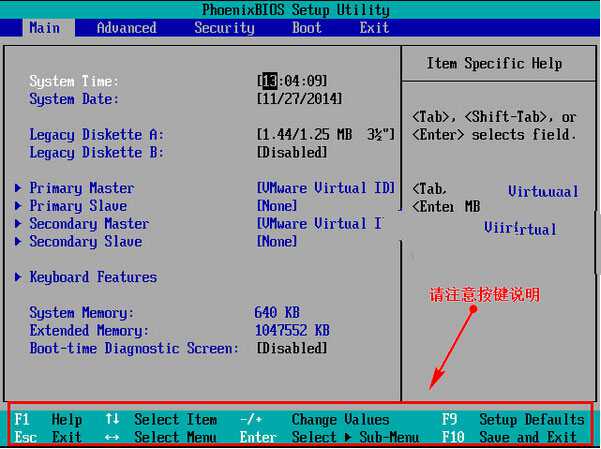 1.进入bios界面设置,在该界面我们要进行几个重要的操作,所以我们要了解界面底部注明:键盘上的方向键进行光标移动;回车键表示“确定”;F10表示“保存并退出”: