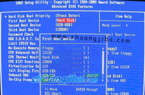 如上图8:在第一启动设备(First Boot Device)这里,有U盘的USB-ZIP、USB-HDD之类的选项,我们既可以选择“Hard Disk”,也可以选择“USB-HDD”之类的选项,来启动电脑。