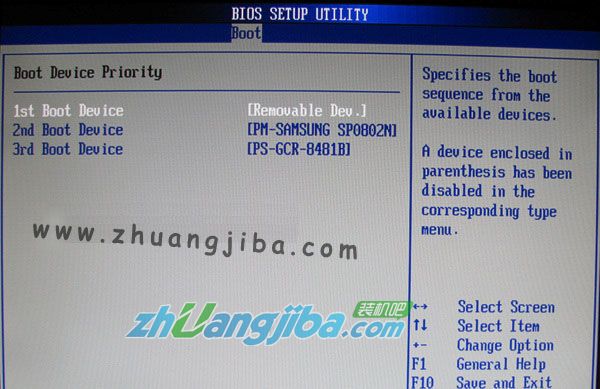 如果在图9的硬盘驱动器“Hard Disk Drives”里面还没选择U盘为第一启动设备,那么这里就不存在和显示U盘,如上图2所示,但可以选择移动设备“Removable Dev.”作为第一启动设备;