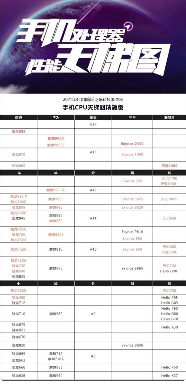 4月份的手机处理器天梯图与3月及2月相似,没有任何改变,目前旗舰机大部分都采用骁龙888处理器或骁龙870处理器。