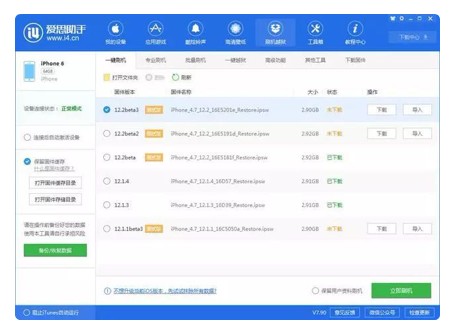 打开爱思助手 PC 端,将设备连接到电脑。在爱思助手【刷机越狱】-【一键刷机】中选择固件,点击“立即刷机”。