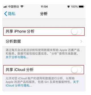 打开 iPhone 【隐私】-【分析】,将【共享 iPhone 分析】与【共享 iCloud 分析】进行关闭。
