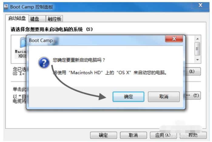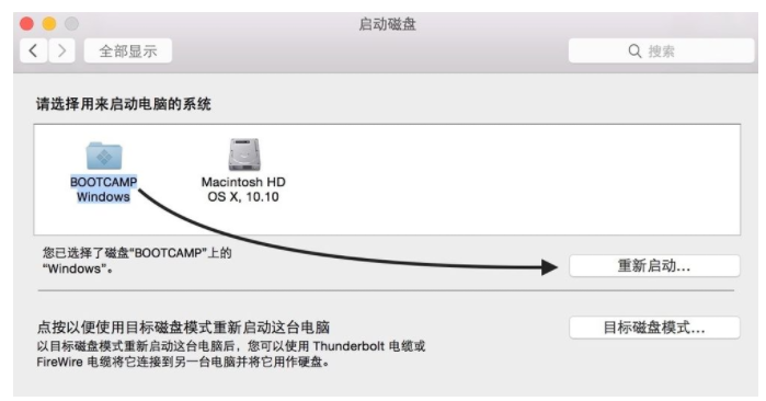 4、选择BootCAMPWindows磁盘,然后点击重启按钮,让计算机在未来一直进入Windows系统。