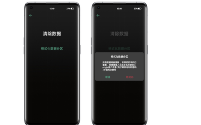 3、进入恢复模式后,在手机的屏幕上选择“简体中文”语言 >清除数据> 输入界面提示的验证码 > 点击“格式化数据分区”> 点击“格式化”,即可重置手机。