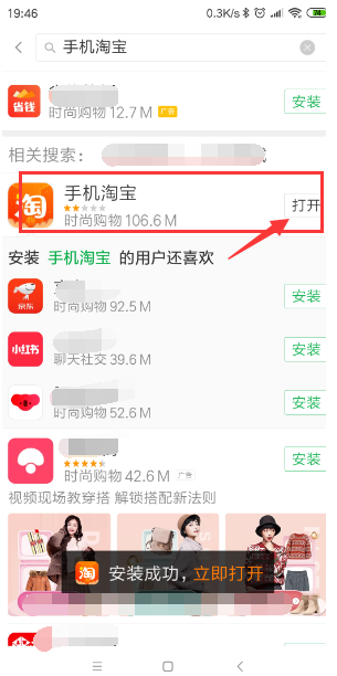 4、等待手机淘宝安装完成之后,选择点击右边的”打开“选项。