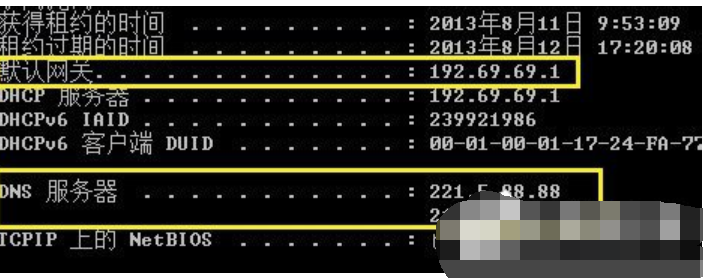 2、我们先输入ipconfig/all,然后回车看看。会弹出一大堆的东西,我们找找对我们有用的信息就好了。主要看路由器的网关和运营商的网关即可。具体请看图片标识。